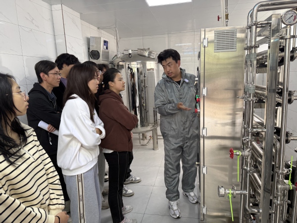 会上,宿管科负责人介绍了直饮水项目的整体运行情况、水质保障措施和未来优化扩建计划。服务商代表带领学生现场参观制水设备并详细讲解制水工作原理。