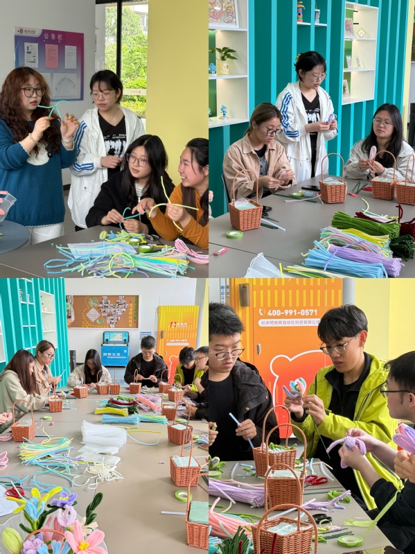 活动现场气氛热烈,同学们专注投入。指尖翻飞间,彩色扭扭棒逐渐蜕变为形态逼真的花束。老师们穿梭其间,一对一指导,帮助大家打造专属作品。